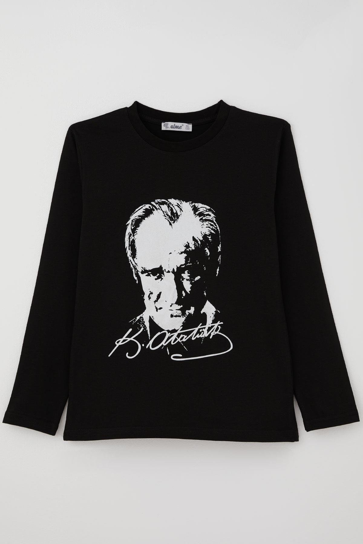 Alg Erkek Çocuk Uzun Kollu Tişört Atatürk Portre Ve İmzalı Siyah (2-17 Yaş)