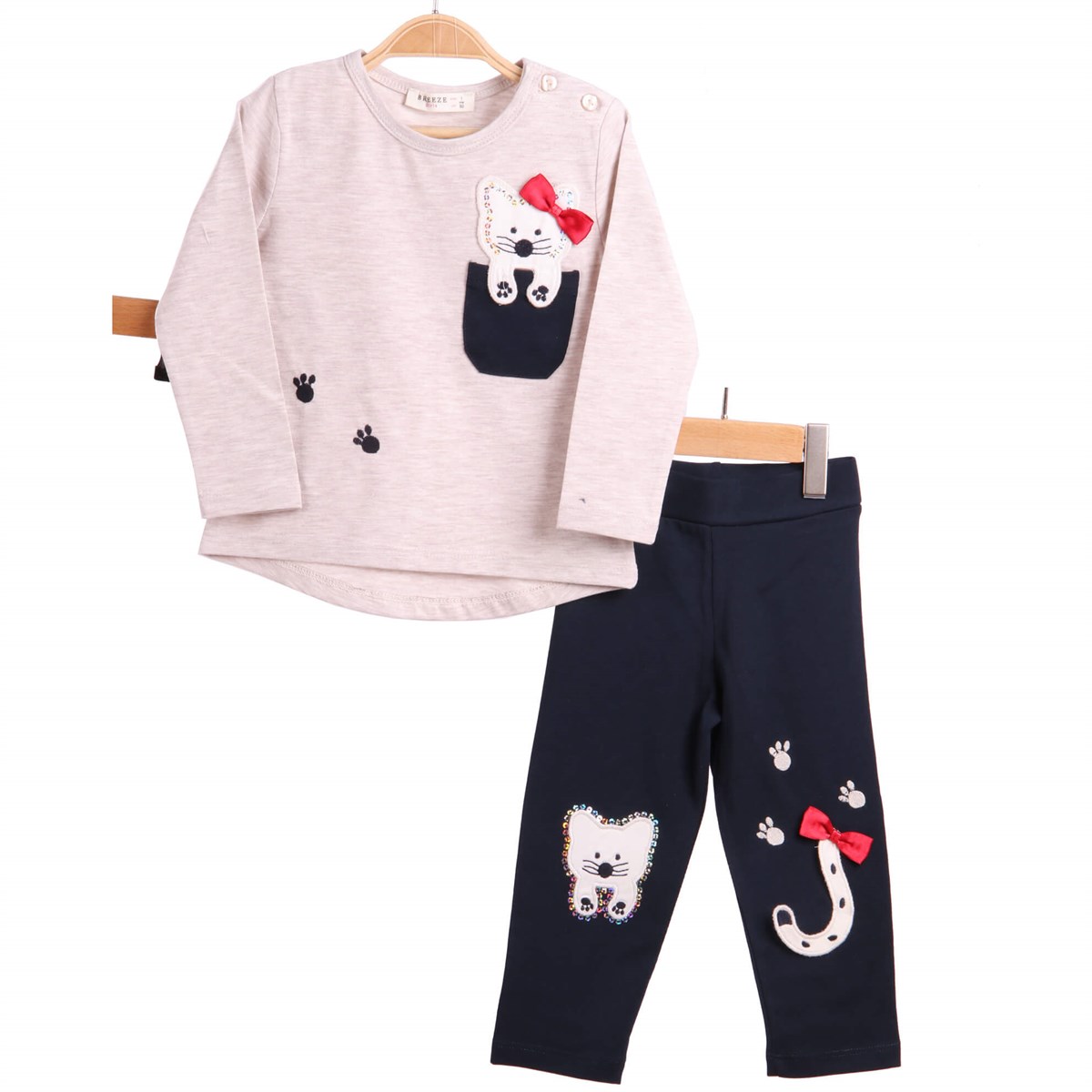 Kız Bebek Taytlı Takım Kedili Bej-Lacivert (1-1.5 Yaş) (11814-105)