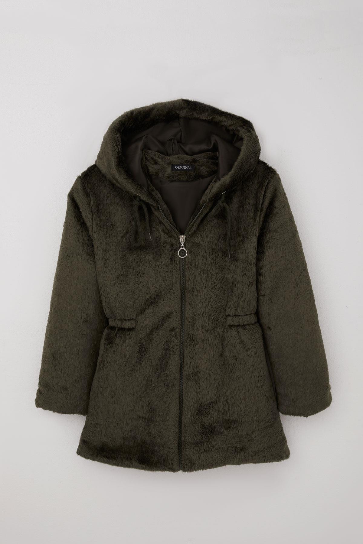Orıgınal Kız Çocuk Peluş Mont Bel Kısmı Lastikli Kapüşonlu Cepli Koyu Haki Yeşil (7-12 Yaş)