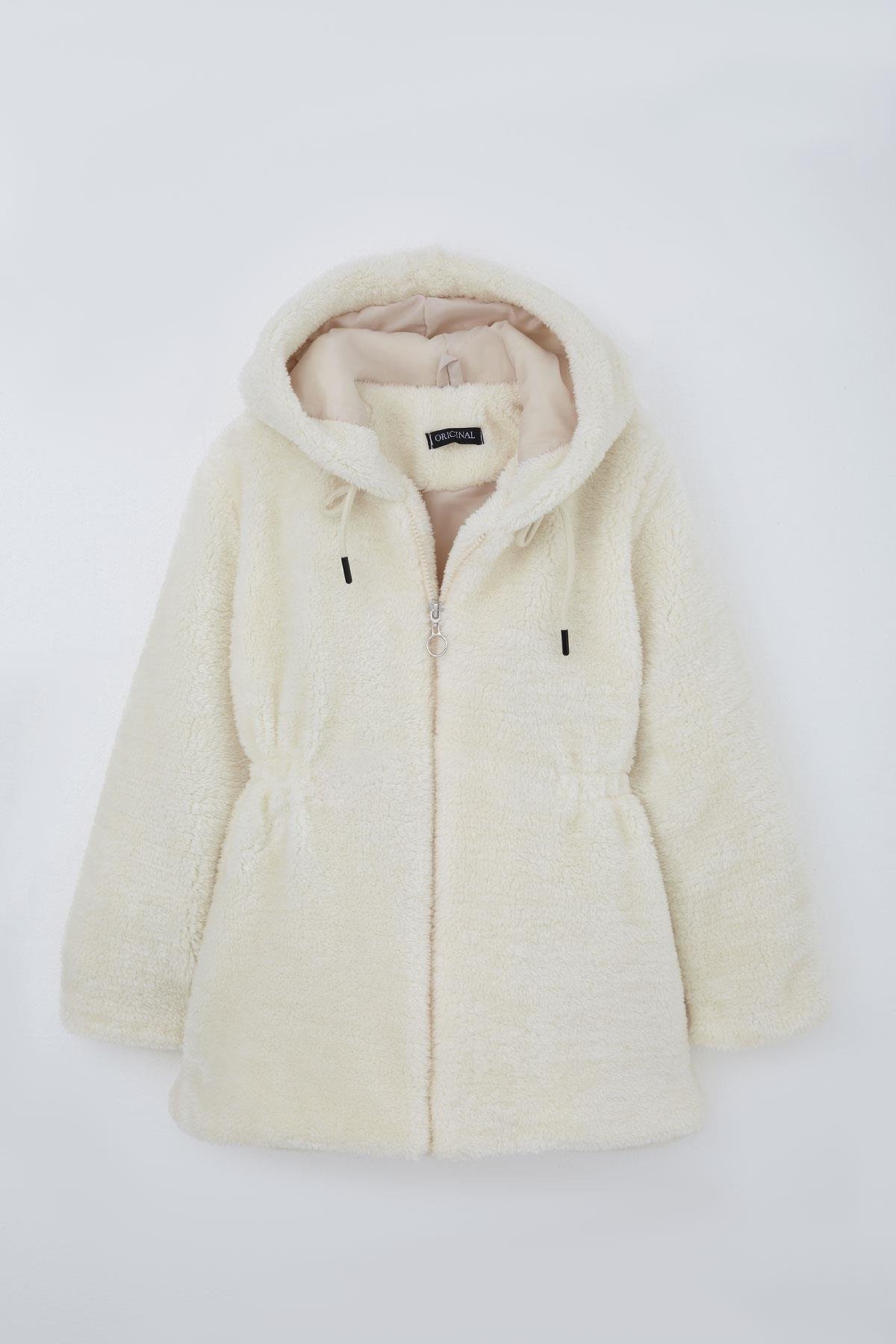 Orıgınal Kız Çocuk Peluş Mont Bel Kısmı Lastikli Kapüşonlu Cepli Krem (7-12 Yaş)