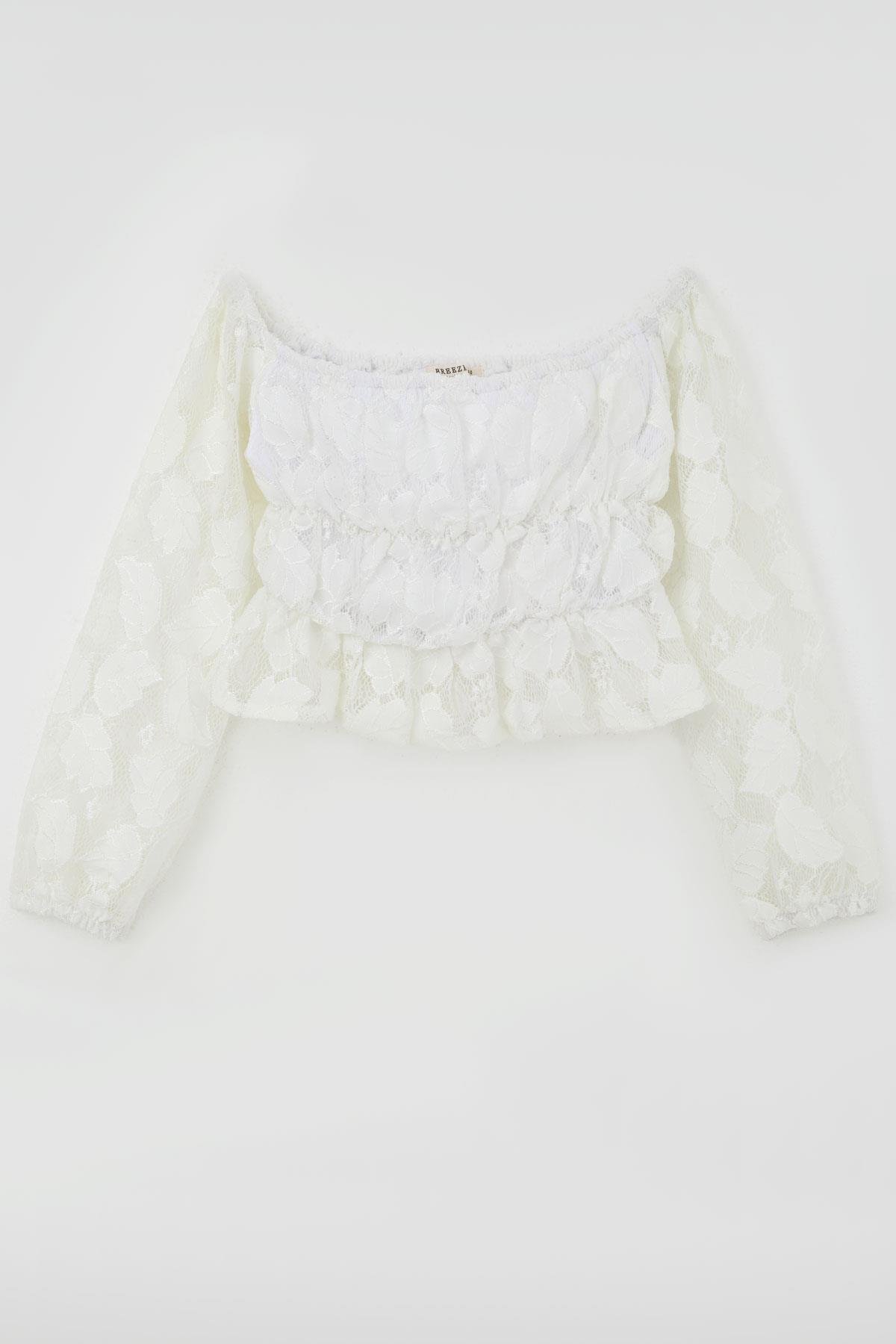 Breeze Kız Çocuk Uzun Kollu Dantelli Crop Bluz Yaprak Desenli Beyaz (9-14 Yaş)