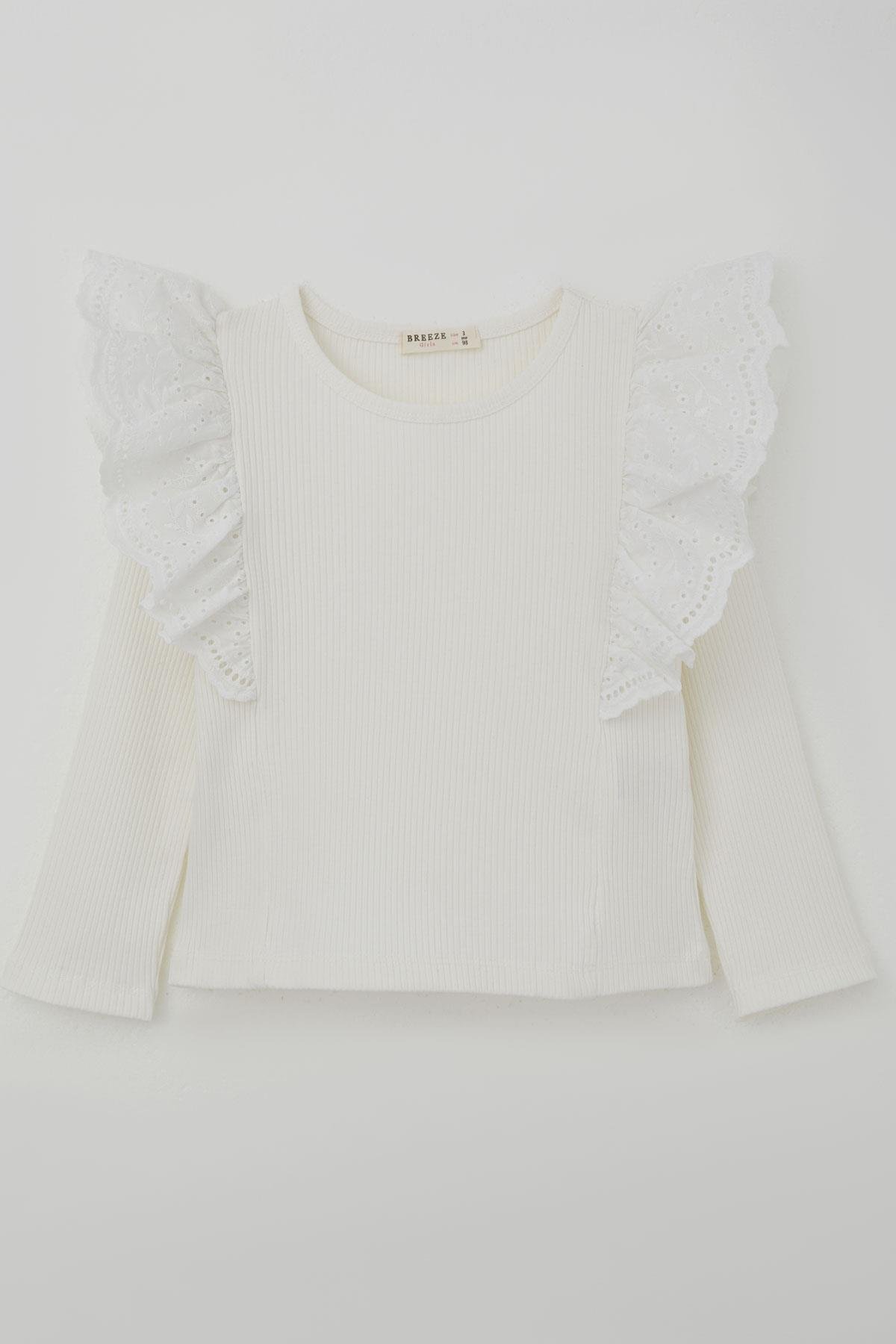 Breeze Kız Çocuk Uzun Kollu Tişört Omuzu Çiçek Nakışlı Güpür Detaylı Ekru (3-7 Yaş)